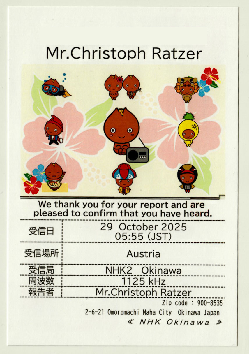 The mediumwave station NHK 2 Okinawa in Tomisiro City confirmed today by post that it had received their morning broadcast on 1125 kHz. This means that I now have mediumwave confirmation of reception from the Ryūkyū Islands in the Pacific both at the end of the evening broadcast and at the start of the early morning broadcast.