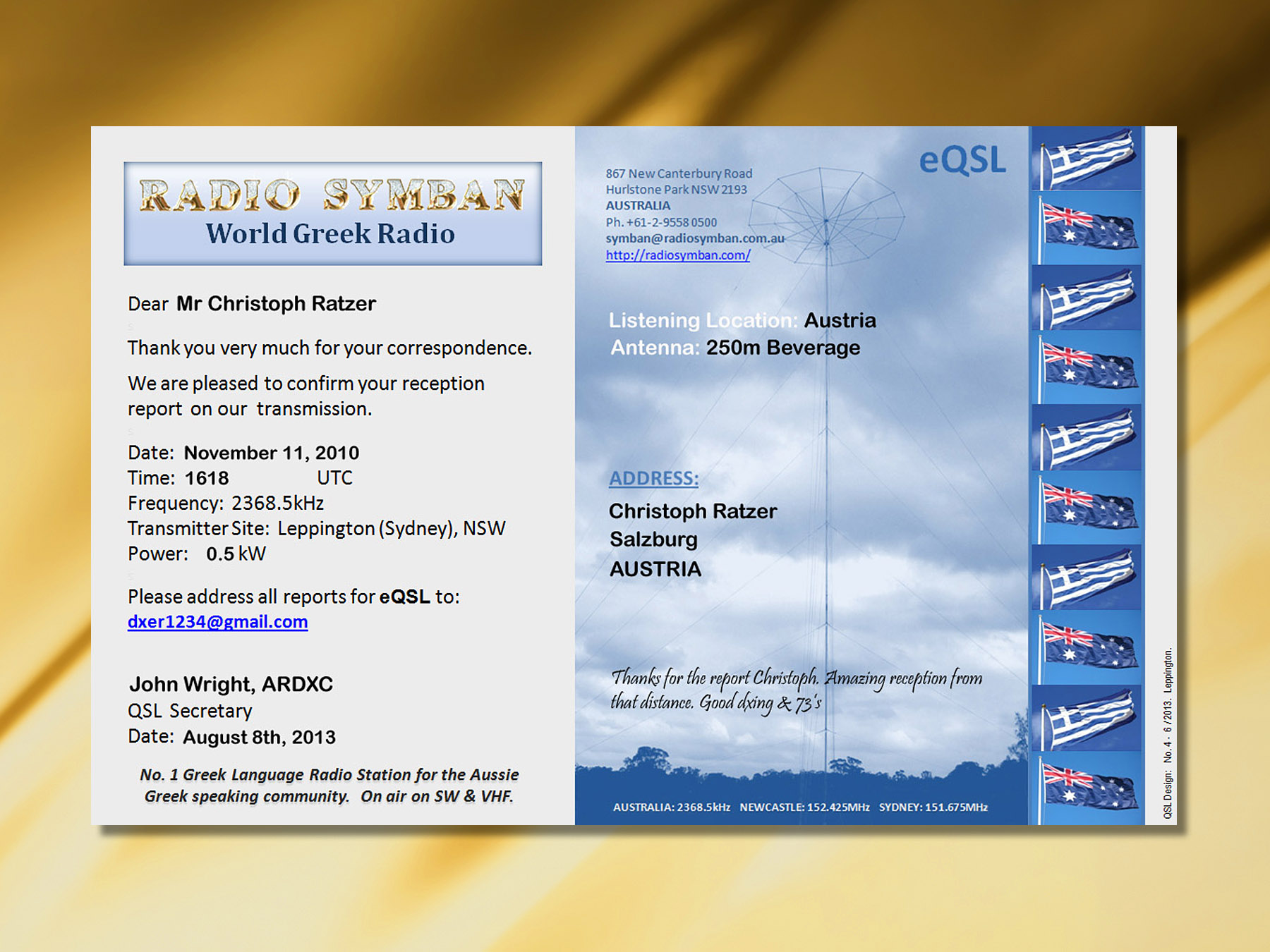 QSL: Radio Symban, Australia. Posted on August 9, 2013 by remotedx Radio Symban, Leppington, Australia, Reception: 11. November 2010, 1618 UT, 2368,5 kHz, 0,5 kW, Perseus SDR, Beverage. Share this: Click to email a link to a friend (Opens in new window) Email Click to share on WhatsApp (Opens in new window) WhatsApp Click to share on Telegram (Opens in new window) Telegram Like Loading... Related