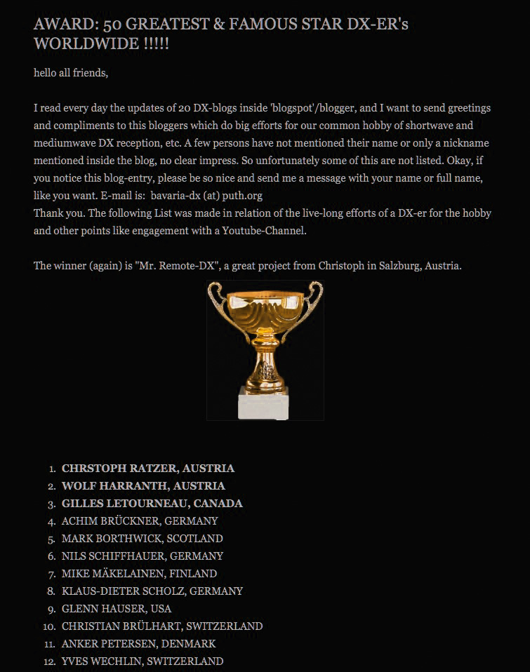A great honor. Posted on October 24, 2014 by remotedx 5 AWARD: 50 GREATEST & FAMOUS STAR DX-ER’s WORLDWIDE.