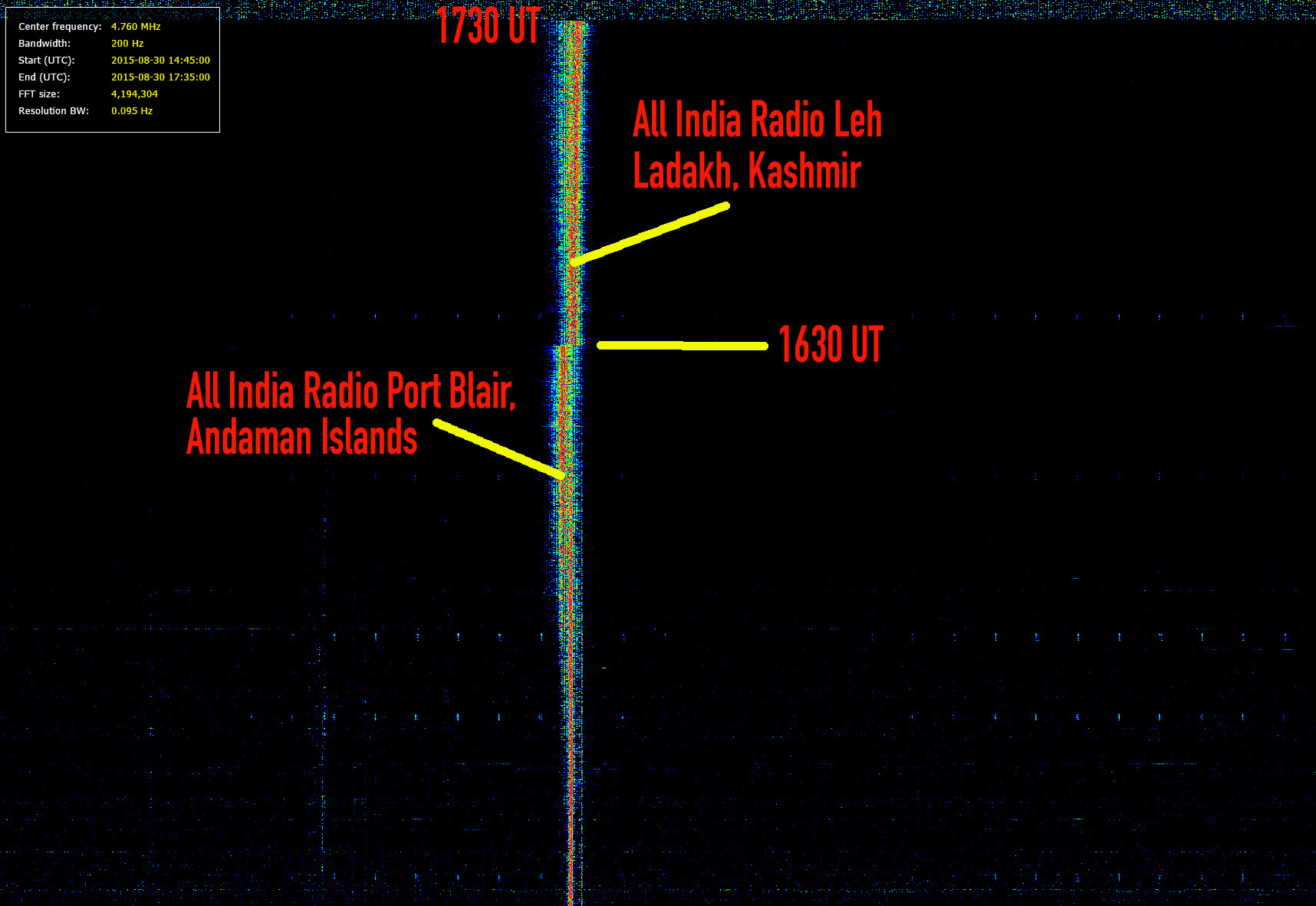 Reception 30. August 2015, 4760 kHz, 1430 – 1732 UT, Winradio Excalibur PRO/CSO, Hari Windom, 78m;