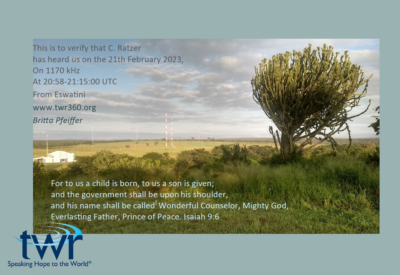 Today I received a special QSL from Africa: Trans World Radio broadcasts from Eswatini, formerly Swaziland, on medium wave 1170 kHz in addition to its shortwave transmissions. However, this frequency is occupied in Central Europe by Radio Capodistria. With my Africa Beverage Antenna and weeks of reception attempts, I actually managed to receive signals from Mpangela Ranch on medium wave on 21 February, 2023.