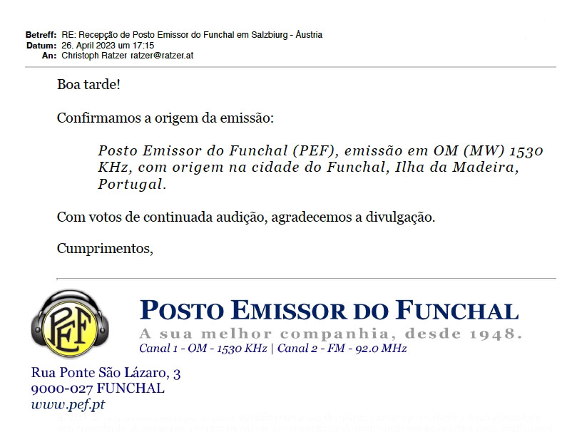 For three weeks I have been recording daily from 22 – 00 UT towards Africa on 1530 kHz to finally catch Madeira after many years – until last week without success, Romania is just too strong in Salzburg. Due to the strong solar storm I thought maybe the medium wave band prefers closer frequencies here. And indeed, on 23 April at 23 UT I was able to receive the daily played pan flute melody briefly in Salzburg. The station confirmed the reception report to me very quickly. My 203rd confirmed radio country according to EDXC list.