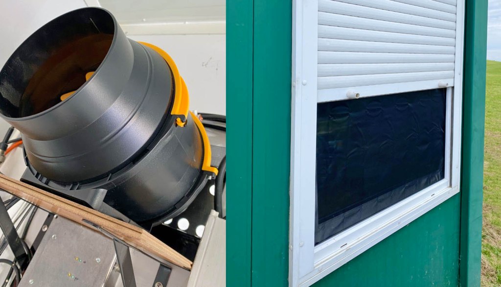 Thinking about summer today: Insect mesh and fan installed. The fine mesh keeps all the fine dust from the meadows away from my PC fans, and the large fan managed to cool the air in the container by 2 degrees in 20 minutes in today’s test. This will come in handy in a few weeks’ time. The fan blows the air out of the container and the opening on the container wall was covered after the photo was taken.