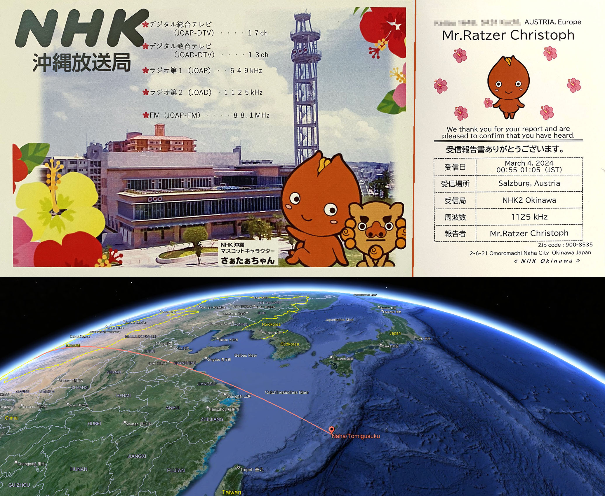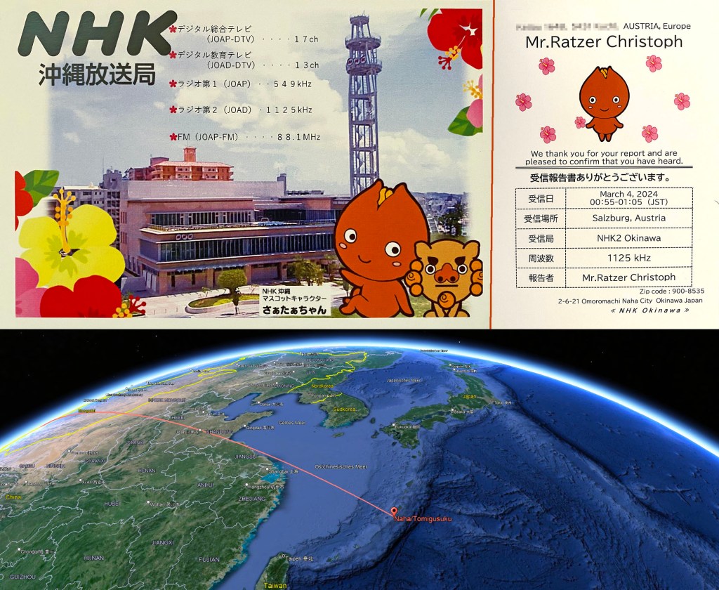Here is a very special QSL card. JOAD NHK 2 from Okinawa Islands in the East China Sea between Taiwan and Japan’s mainland confirmed the reception of its medium wave station here in Salzburg on 1125 kHz from the beginning of March 2024 with this beautiful QSL card and many stickers so popular in Japan. A rare and beautiful end to the MW season 2023/2024.