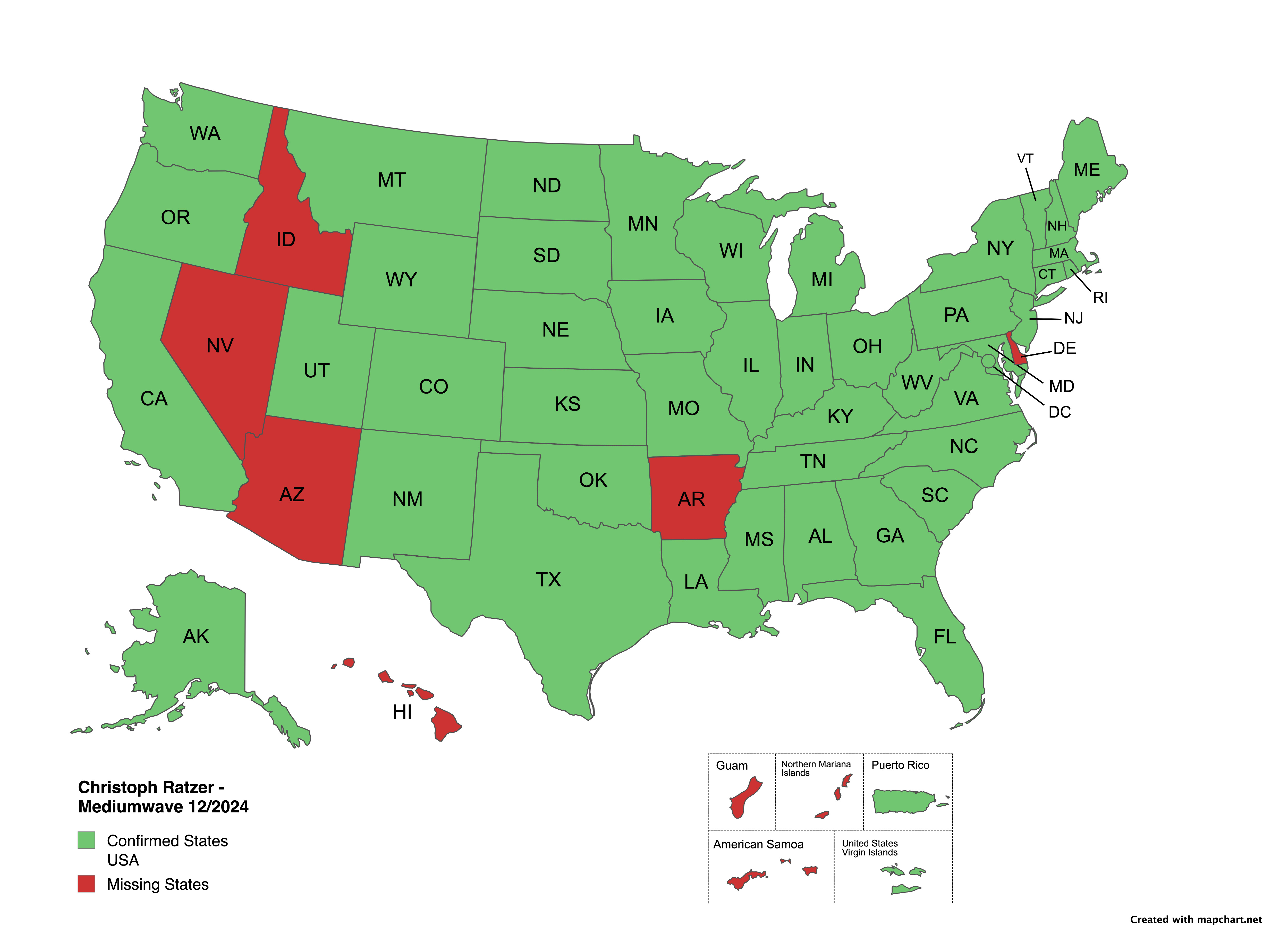 45 verified! Now it will be even more difficult. Stations from Delaware and Arkansas simply cannot be heard. And for a reception from Arizona, Nevada and Idaho, you need a lot of luck as well as the help of the sun. And we don’t even want to think about Hawaii here in Central Europe.