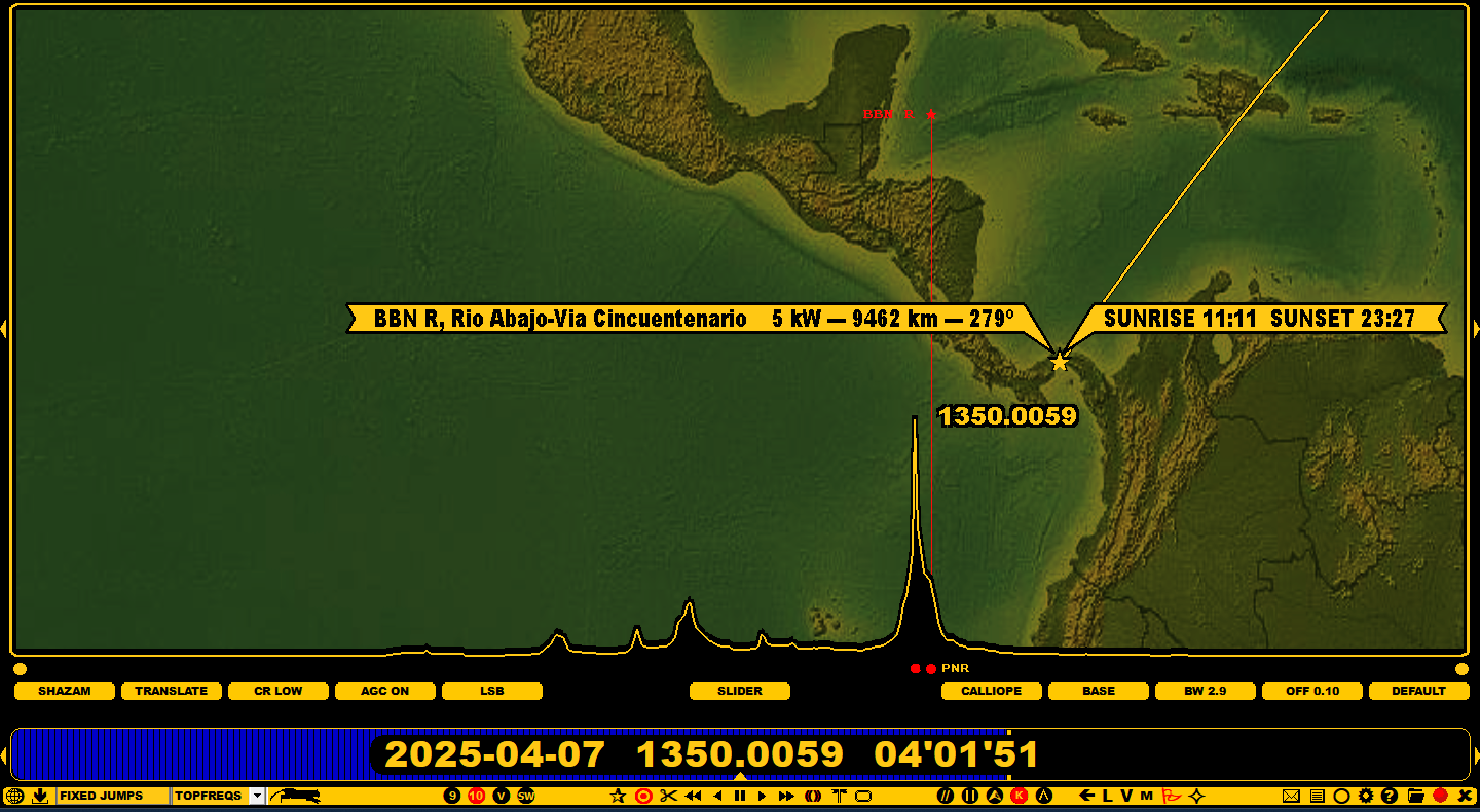 Panamá. Posted on April 7, 2025 by remotedx BBN Panamá today on 7 April 2025 very good around 04 UT on 1350 kHz. Share this: Click to email a link to a friend (Opens in new window) Email Click to share on WhatsApp (Opens in new window) WhatsApp Click to share on Telegram (Opens in new window) Telegram Like Loading... Related
