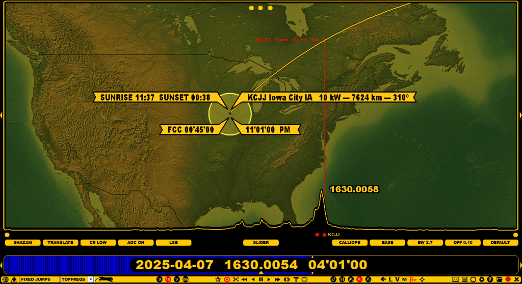 KCJJ, Iowa. Posted on April 8, 2025 by remotedx On April 7, strong signals could be received on many US channels in Salzburg, even distant stations such as KCJJ, Iowa City, on 1630 kHz could be heard well on my Beverage antenna. Share this: Click to email a link to a friend (Opens in new window) Email Click to share on WhatsApp (Opens in new window) WhatsApp Click to share on Telegram (Opens in new window) Telegram Like Loading... Related