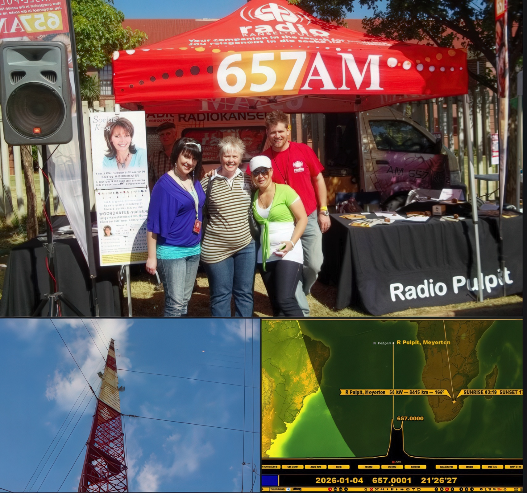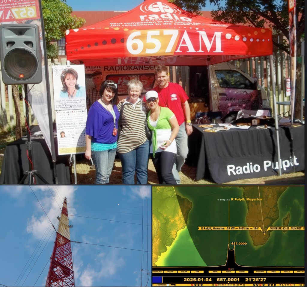 South Africa. Posted on January 8, 2026 by remotedx Radio Pulpit from Pretoria, South Africa, confirmed my report regarding reception of the mediumwave 657 kHz in Salzburg. They broadcast via a transmitter in Meyerton with an output of 50 kW. Share this: Click to email a link to a friend (Opens in new window) Email Click to share on WhatsApp (Opens in new window) WhatsApp Click to share on Telegram (Opens in new window) Telegram Like Loading... Related