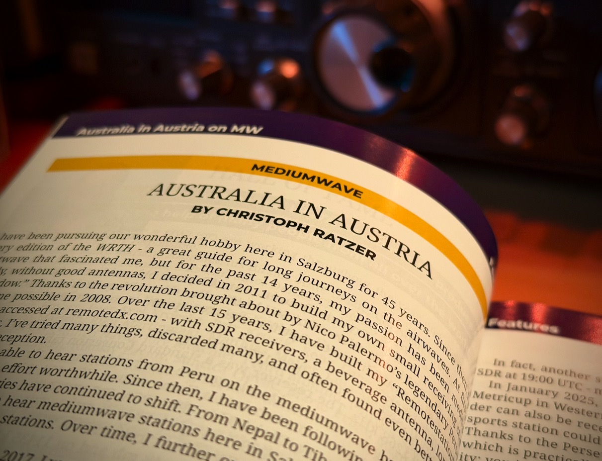 In the WRTH Yearbook 2026, I had the opportunity to write an article about my medium wave reception from Australia. Australia is a difficult task here in Salzburg, but a worthwhile goal. Due to the shutdown of some stations in Europe, reception in the evening hours is quite possible if you have a lot of patience. Enjoy my article in the WRTH!