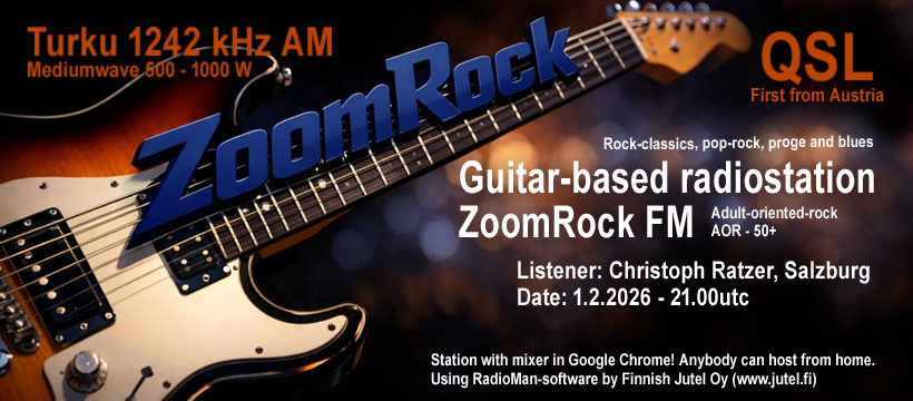 Finland. Posted on February 28, 2026 by remotedx A very nice QSL card from ZoomRock’s first official broadcast day from Finland on medium wave 1242 kHz. The transmitter is located in Naantali, one of Finland’s oldest cities, and has a licence for three months, until the end of April. Share this: Email a link to a friend (Opens in new window) Email Share on WhatsApp (Opens in new window) WhatsApp Share on Telegram (Opens in new window) Telegram Like Loading... Related