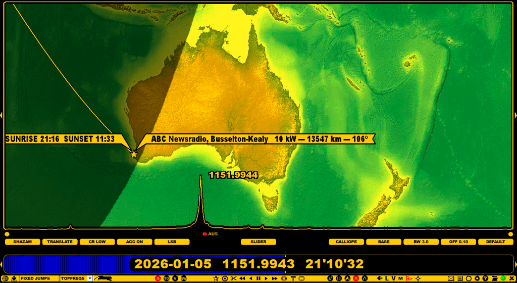 At the beginning of January 2026, I was able to hear ABC News Radio, 6PB from Busselton, on the now free frequency 1152 kHz in Salzburg. To my surprise, the signal was not only audible for minutes, but Jaguar’s good spectrum image is of course a great help with such weak signals. Graham Himmelhoch-Mutton, ABC Master Control Radio, very kindly confirmed reception, my third QSL from an Australian ABC station that I was able to receive in Salzburg.